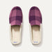 • Mauve and deep purple plaid mule-style upper with deep purple stitching.